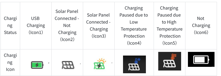 Icon 5 Displayed: Ambient Temperature Above 60℃ — Solar Charging Paused, Will Resume Automatically When Temperature Drops.